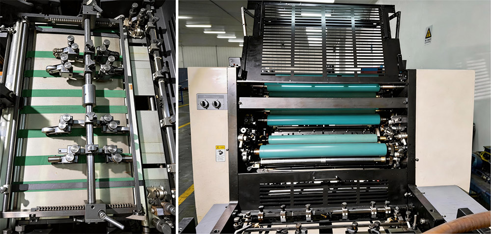 6) Popieriaus transportavimo mechanizmai, tokie kaip popieriaus padavimo galvutė, popieriaus staliukas, priekinis kreiptuvas ir popieriaus griebtuvai, užtikrina, kad presas gali spausdinti ant įvairiausio popieriaus nuo storo iki plono popieriaus.