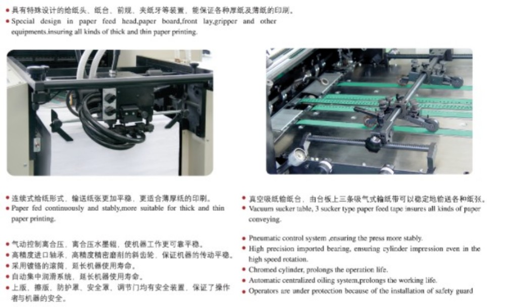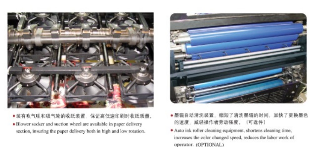 Didelės A3 keturių spalvų pakuotės ofsetinės spaudos spauda sukurta su itin našiais moduliais ir jie visi yra aukščiausios kokybės – itin tikslūs ritinėliai ir krumpliaračiai, stiprus popieriaus tiekimo mechanizmas, didelio tikslumo popieriaus registravimo sistema ir stabili rašalo tiekimo sistema. Jis sukurtas taip, kad atitiktų rinkos reikalavimus kokybiškam, efektyviam ir prieinamam spalvotam spausdinimui iš iškirptų lapų. Taip pat nereikia laikytis vieno storio popieriaus – jis veikia su plonu popieriumi (0,04 mm) iki storo kartono (0,4 mm). Taip pat yra jutiklinio ekrano valdymas su intuityvia programavimo sąsaja, leidžiančia sumaniai ir paprastai reguliuoti nustatymus ir spausdinimo parametrus.