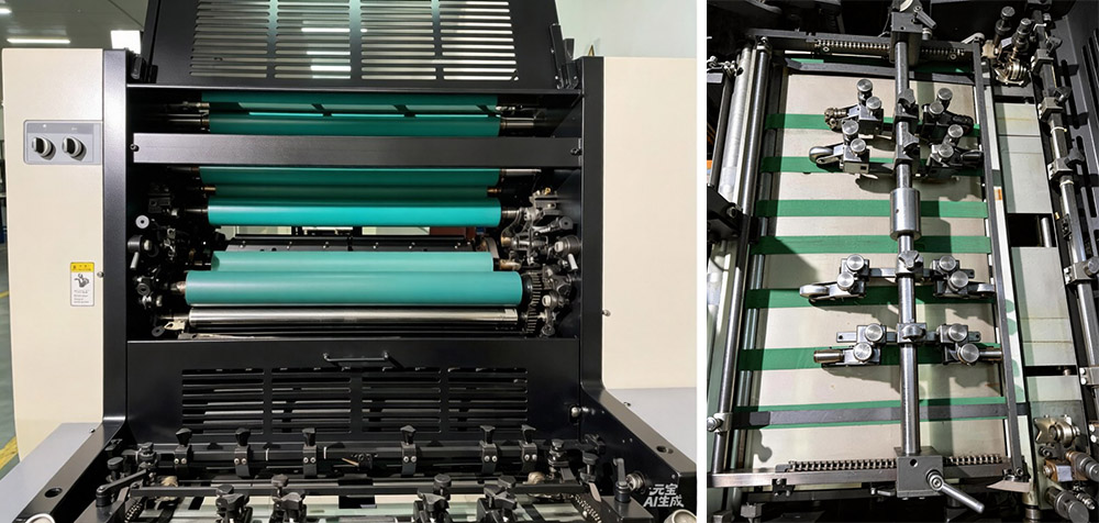 Didelė A3 storio popieriaus vienspalvė ofsetinė spausdinimo mašina išsiskiria savo aukščiausios klasės savybėmis, dėl kurių ji yra patikima ir efektyvi. Jis turi tvirtą mechaninę struktūrą – ketaus vientisą pagrindą, šonines plokštes ir volelius – todėl yra tvirtas, standus, atsparus dilimui ir sugeriantis smūgius. Tai reiškia, kad jis veikia sklandžiai net ir dideliu greičiu, kiekvieną kartą išlaikant pastovų spausdinimo slėgį. Chromuoti spausdinimo cilindrai labai gerai atsparūs dilimui, todėl aparatas tarnaus ilgiau ir sumažinamos kasdienės priežiūros išlaidos. Dėl didelio tikslumo guolių ir įžemintų sraigtinių krumpliaračių jėgos perdavimas yra tolygus ir sklandus, be virpesių ar trikdžių. Saugumas taip pat yra prioritetas – saugos įtaisai yra įmontuoti į plokščių montavimą, valymą, apsauginius dangčius ir durų reguliavimą, kad operatoriai ir mašina būtų saugūs. Pneumatinis sankabos ir rašalo ritinėlių valdymas užtikrina patikimumą, be netikėtų problemų. Plokštės tvirtinimo mechanizmas turi greitą padėties nustatymą ir įtempimą, todėl sutaupoma sąrankos laiko. Jo popieriaus transportavimo dalys – tiekimo galvutė, popieriaus staliukas, priekinis kreiptuvas ir griebtuvai – tinka visų tipų popieriui, nuo storo iki plono. Pasukamas popieriaus tiektuvas užtikrina sklandų darbą dideliu greičiu, o plokštės ir antklodės cilindrai su laikiklio žiedais užtikrina aukštos kokybės spaudinius dideliu greičiu. Dvigubos spyruoklės griebtuvai tvirtai laiko popierių, neslysta net ir ilgai spausdinant. Be to, pusiau automatinę rašalo ritinėlių valymo sistemą lengva naudoti – ji sutrumpina valymo laiką, pagreitina rašalo spalvos pasikeitimą, palengvina darbo krūvį ir padidina gamybos efektyvumą. Jame taip pat yra PLC valdymas ir jutiklinis ekranas su paprasta, lengvai naudojama sąsaja operatoriams.